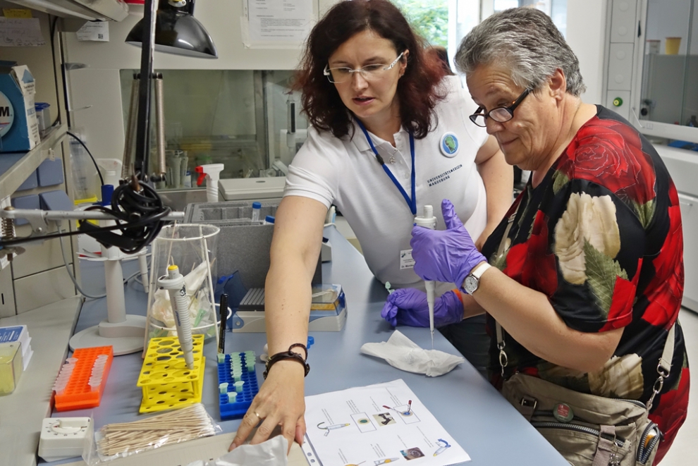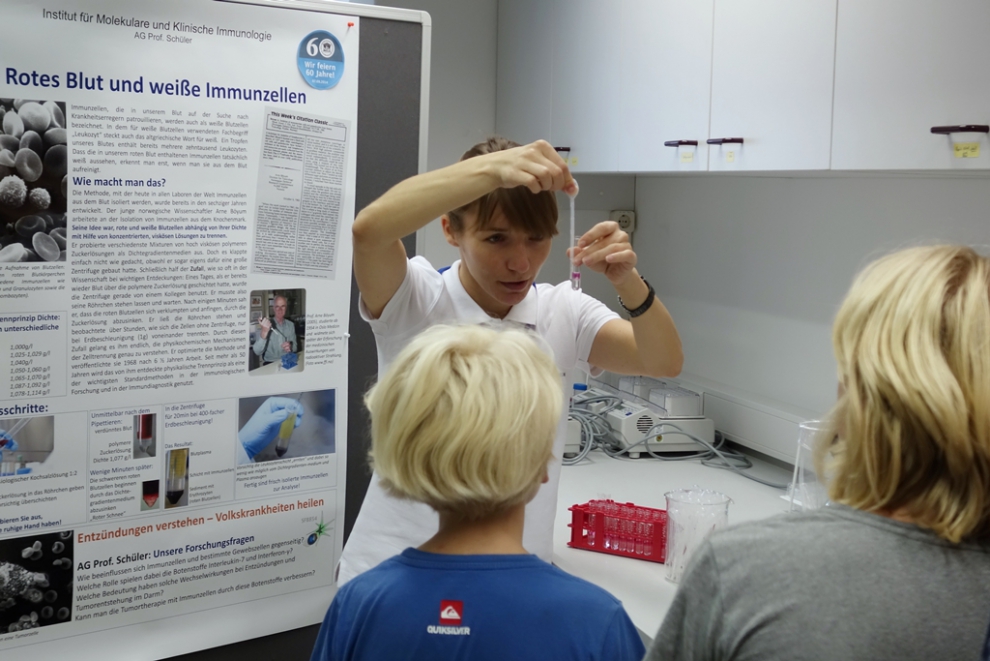 In celebration of the 60th Anniversary of University Medicine in Magdeburg, the many institutes and clinical departments opened their doors.  In the laboratories of the Institute of Molecular and Clinical Immunology, there was a lot going on.  The doctoral students of the MGK 854 worked hard to offer the many visitors an exciting program.